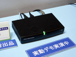 DXアンテナでは、現在は対応スマートフォンでしか視聴できないnottvをテレビでも視聴できるようにする外付けチューナーを参考展示。実際に上映デモも行っている。「課金システムをどうするかなど検討事項も残っているためまだ詳細は固まっていない。デモは現在のスマホ向け映像をそのまま拡大しているが、20インチ程度のテレビであればそれなりに鑑賞に堪えられるレベルではないかと思っている」(同社説明員)とのことだった。