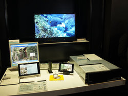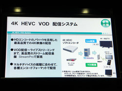 コーデック関連では、NECが4K HEVC VOD配信システムを参考展示。同社の4K HEVCソフトエンコーダーと、ストリーム配信基盤「StreamPro」によって4KをVOD配信できるシステムで、マルチデバイス視聴に合わせて各種エンコードフォーマットで配信可能。「すでに運用できる状態ではあるが、スマートフォン/タブレットは4K対応アプリがなく、我々はアプリを開発する立場でもないため、その部分で“待ち”の状態」(説明員)とのことだった。