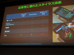 本機のペン入力機能の完成度について、矢戸氏は「アクティブスタイラスレベルの、スムーズで心地良いフィーリングが、従来の静電容量方式のパネルで実現できた」と胸を張る。なお、本機では付属スタイラス以外の汎用品によるペン入力にも対応している。