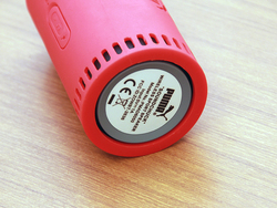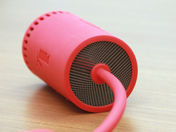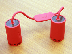 左右スピーカー部をシリコン製アームで繋いだ“ヌンチャク型”のデザインが特徴的なモデル。質量は440g。内部には、1.5cmのスピーカーユニットを左右に2基ずつ搭載している。出力は2W×2。再生周波数帯域は80Hz〜20kHz。音声はBluetoothのほかに、3.5mmステレオミニ経由での入力も行える。