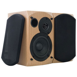 UPB-BF01は、木製キャビネットを採用したアクティブ型の2chスピーカーで、価格は3,980円(税込)。出力は7W×2。周波数特性は40Hz〜20kHz。音声入力用にRCA端子を装備している。サブウーファー出力用端子も装備。背面には音量調整ノブと、BASS/TREBLEの調整ノブを備えている。外形寸法は113W×120H×146Dmmで、質量は2.8kg。