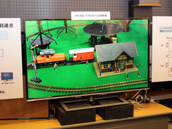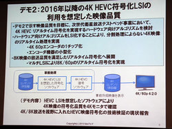 これとは別に、2016年のCS110度やその後のBSでの8K試験放送に向け、より高精度の圧縮技術をシミュレーションした再現デモも実施。より高画質な4K HEVC符号化が可能なLSIが開発されることを想定し、現時点ではそのLSIでの処理を模したソフトウェアを用意し、映像再生デモを行った。