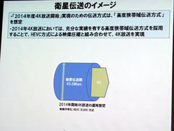 なお、2014年度の4K放送での伝送方式として「高度狭帯域伝送方式」を想定しているのは、実績のある同方式とHEVC方式による映像圧縮とを組み合わせることで4K放送を実現させるという狙い。40.5Mbpsという衛星伝送路で、35Mbp程度の映像データを伝送するイメージだという。
