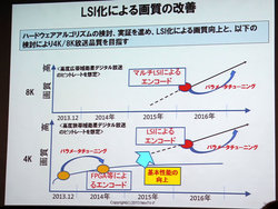 このシステムにおいては、ハードウェア向けアルゴリズムをLSI化することにより、分割処理によらない4K映像のリアルタイム処理を実現することを想定。4K/60pのエンコーダーの1チップ化、エンコーダー機器の小型化を目指す。そして、8K映像の放送品質を満足したリアルタイム符号化へ展開。マルチLSIにより8K/60pのリアルタイム符号化実現を目標にしている。
