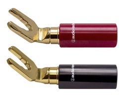 「AT6305」はダブルネジ方式のYラグ端子で、こちらも無ハンダのYラグ端子を採用。素材は真鍮とABS樹脂となり、金メッキ処理が施されている。芯線の撚り径は1.5mm〜4.0mmまでに、ターミナル径は6.0mmまでに対応となる。1個あたりの質量は8g。