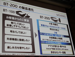 BT-200本体については、従来モデルBT-100に寄せられたユーザーの声をフィードバックさせ、様々な改良を行ったという。大きくはディスプレイ部の「質量」「画面の明るさ」や、機能面で「外部機器との接続」などの点を見直している。