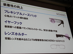 ノーズパッドには心地よいフィット感を実現できるよう調整できる「フレキシブルノーズパッド」を採用。イヤーフック部も、後頭部への重量バランスをコントロールできる仕組みとするなど装着性の向上を図っている。また、ユーザーが市販レンズを組み込むことで“度入り”のBT-200にカスタマイズできるレンズホルダー部も設けている。