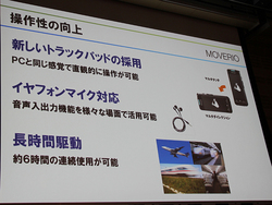 なお本日、渡辺氏は実際にBT-200を装着し、同機で発表原稿を再生してそれを読み上げる形でプレゼンを実施。「BT-200をビジネスシーンで活用するデモンストレーション」ともいえる発表を行った。「プレゼンの際は、内容を暗記するのも大変だし、舞台上で手元の資料を見ながら発表を行うのも大変だ。しかしスマートグラスを使用すれば、自分の目の前にプレゼン資料を表示させつつ、シースルー画面を通して観衆の皆さんの顔も見ることができる。こういった使い方で、もっとビジネスシーンを便利なものにできる」と、スマートグラスの使用例をアピールした。