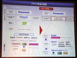具体的な製品・サービスの展開思想としては、「A Better Life, A Better World」の下に、「Panasonic Beauty」や「Panasonic Living」などのカテゴリーネーム、「VIERA」などのプロダクトネーム、「nanoe」などのテクノロジーネームを置く形だ。「VIERA」や「LUMIX」などこれまでサブブランドとして大きく展開していた名称を“発展的に解消”し、カテゴリーネームの下に位置するプロダクトネームの1つとして位置づけるようにした。パナソニックでは今後、これらの階層分けで全ての製品を語って行くとしている。