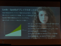 また、Facebookとの相性の良さもアピール。「あたかもFacebook上で音楽が流れているような感じ」(野本氏)だという、自分が今どんな曲を聴いているのかをFacebook上で公開できる機能を備えていることや、アーティストの「Lorde」をFacebookの初代CEOであるショーン・パーカー氏がSpotifyのプレイリストで紹介したことが後のビルボードチャート1位獲得のきっかけになったことなどを紹介した。