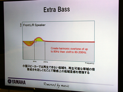 「Extra Bass」は、聴感上の低音の力感を増強する技術。これにより、設置環境の問題でサブウーファーが置けなかったり、小型のスピーカーしか使用できないような場合でも、シアターや音楽再生時に充実した低音を楽しめるようにしている。具体的には、80Hz以下の低域成分を、フロントスピーカーが担う80Hz〜200Hzまでの帯域に倍音成分として足し込むことで、聴感上の低音の力感を増強する仕組み。
