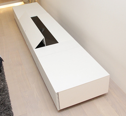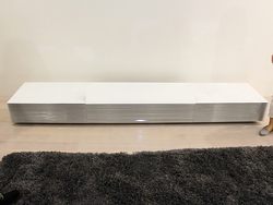 「4K超短焦点プロジェクター」は、真ん中のプロジェクター部のほか、左右に配置するスピーカーユニット部と、BDレコーダーなどを収納できるキャビネット部で構成される。外形寸法は1,100W×265H×535Dmm。スピーカーユニット部は200W×265H×535Dmmで、キャビネット部は600W×265H×535Dmmとなる。