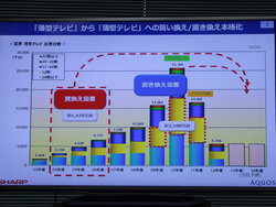 さらに、エコポイントで大きく需要が伸びた2010年やアナログ停波の2011年にテレビを購入した層についても「大きな混乱の中での買い物となり、本当に満足のいくものを買えただろうか。『もっと大きなサイズがよかった』『もっと違うモデルがよかった』と思っているお客様による『置き換え需要』もある」と述べ、ここに2,100万台程度の需要を見込むとした。