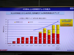 さらに、XL10シリーズの特徴である高精細という点も好評だと紹介。XL10の導入後、4K対応や高精細モデルの販売構成比が伸びていること、2014年3月には、他社製も含めた4Kテレビ全体に匹敵する割合でXL10シリーズが売れたというデータも紹介した。