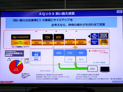 こうした需要に対して、同社では「買い換えの法則」として、画面面積をユーザーが現在使用しているモデルの2倍以上にすることを提案していると説明。「画面の高さが1.5面になると面積が2倍になる。当時37インチだったら現在の60インチがそれにあたる。感動を2倍にしようという提案だ」とするとともに、CCFLからLEDバックライトになることによる省エネ性能の向上、クワトロンによる色再現性の向上、4K化による高精細といった技術的進化も合わせて提案していると述べた。