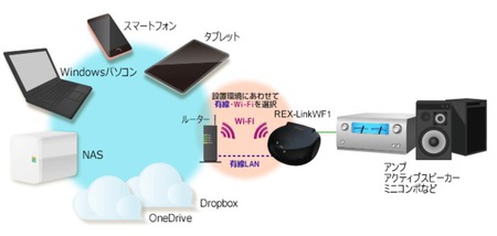 ラトックシステム(株)は、ハイレゾ対応のWi-Fi/LANミュージックレシーバー「REX-LinkWF1」を4月下旬に発売する。価格は16,800円(税抜)。