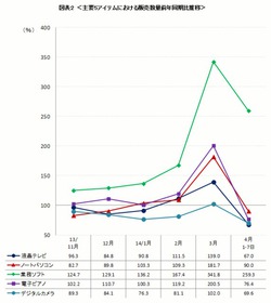 そのほかスマートフォンを含む「携帯電話・PHS」(3月120.1%、4月速報値65.8%)、「デジタルカメラ」(3月102.0%、4月速報値69.6%)、「タブレット端末」(3月157.0%、4月速報値86.4%)など、3月から4月にかけて大きく減速している