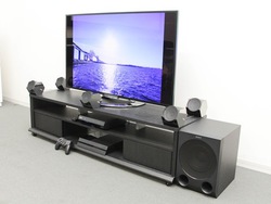外形寸法/質量は、フロント・リア・センタースピーカーが約114W×100H×102Dmm/0.41g、サブウーファーが約245W×350H×325Dmm/6.2kg、アンプ部が249W×62.5H×229.5Dmm/1.6kg。