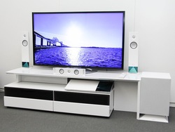 スピーカーは薄型かつ軽量なデザインを採用。壁掛け設置もしやすい仕様にすることで、スピーカースタンドを使用しての5.1chシステム構築が難しいというユーザーに配慮している。スピーカーユニットには、ダンパーレス化することで音の歪みを抑える磁性流体ユニットを採用。フロント/リア用スピーカーには80mm磁性流体ユニットと20mmソフトドームトゥイーターを、センタースピーカーには60mm磁性流体ユニットを搭載している。サブウーファーは180mmドライバーを搭載する。