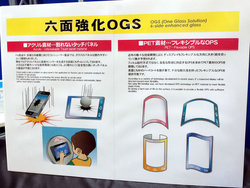 リーダーメディアテクノは、アクリルパネルに直接センサーを生成する技術によって「割れないタッチパネル」を作成しようとチャレンジしていることや、PET素材の採用によって曲げなどにもフレキシブルに対応できるようにする技術などを紹介。合わせて、ベゼル部にもシルク印刷することによって、スマートフォンやタブレットの本体色とディスプレイ部周辺とのカラーリングを同一にできるなどといった技術を披露している。