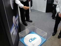 タイカでは、ビルの6階相当の高さから生卵を落下させても割れないという衝撃吸収性をもつゲル状素材「αGEL」を、ディスプレイ用に応用した「OPTαGEL」を展示。