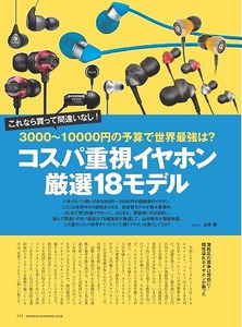 さて、第2弾のみどころです。消費増税の影響でフトコロ具合が…そんなみなさんには、特集「1万円以内、世界最強を探せ! コスパ重視イヤホン×18」にご注目を! 実はいまイチバン熱いのが3,000円〜10,000円の価格帯。スペック的にも音質的にも個性あふれる高音質モデルが続々登場中! そのなかでも、選んで間違いのない超高コスパな逸品だけを編集部が厳選して、本誌ライター・山本敦氏が徹底検証しました。はじめて買う高級イヤホン、または普段使いの2台目を選ぶガイドとしてぜひお役立てください。