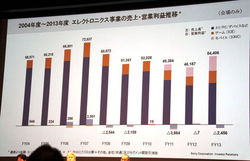 さらに吉田CFOは、2004年度から2013年度にかけての、エレクトロニクス事業の売上げ・営業利益率の推移を表したグラフを見せ、2007年度はSCEを除くエレクトロニクス事業の売上げが約6兆円だったのに対して、2013年度は3.2兆円程度と、ほぼ半減していることを指摘。「この6年間、ほぼ構造的な赤字となっている」とした。
