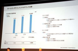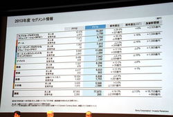 セグメント別に'13年度の業績を見ていこう。テレビ事業を含むホームエンタテインメント&サウンド分野では、為替の好影響および高付加価値モデルの導入による液晶テレビの製品ミックスの改善などにより、売上高が前年度比17.5%増の1兆1,686億円となった。さらに、液晶テレビの製品ミックスの改善や費用削減効果によって、前年度588億円の営業損失から今期は255億円の損失に縮小した。