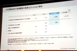 吉田CFOは、'14年度に1,340億円の構造改革費用を見込むことについて、PC事業終息に伴う費用が引きつづき360億円程度必要となるほか、販売会社や本社の構造改革費用も想定していると説明。また、新たに減損処理を行う必要が出てくる理由も加味し、1,340億円という費用を見通しとして提示したという。