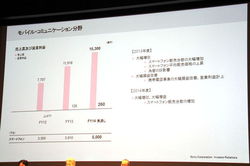 モバイル・プロダクツ&コミュニケーション(MP&C)分野は、売上高が前年度比29.6%増の1兆6,301億円、営業損益は前年度比221億円減の750億円となった。スマートフォンの販売台数の大幅な増加と平均販売価格の上昇、ならびに為替の好影響などにより、分野全体で大幅な売上高増となったが、構造改革費用の増加やPC事業の損失拡大によって営業損益は前年度から減少した。