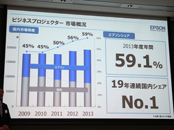 本日、同社はプレス向けの新製品発表会を開催した。発表会に登壇したエプソン販売(株)取締役 販売推進本部長 中野修義氏は、「2013年度のビジネスプロジェクター市場でエプソン製品は59.1%と、19年連続で国内シェアNo.1を獲得している。今年は、既存領域であるフロントプロジェクター製品についてはシェアを維持し、成長領域であるインタラクティブ機能付きプロジェクターと高光束プロジェクターに重点をおいて新商品を投入し、台数・シェアを拡大していきたい」と、ビジネスプロジェクター2014年夏新製品の展開思想を語った。