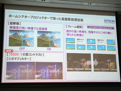 ホームシアター用プロジェクターで培った高画質化技術を採用した点が特徴で、入力映像の解像度を高める「超解像技術」を搭載。コントラスト比はいずれも15,000対1となる。内部にはDCDiチップを搭載し、動きの速い映像でもジャギー感を抑えるプログレッシブ変換機能や、モスキートノイズを抑えてクリアな映像再現を可能にするモスキートノイズリダクション機能などに対応している。