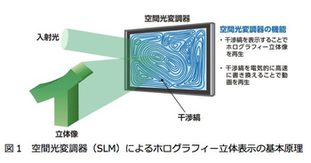 NHKでは、特殊なメガネをかけなくても自然な立体映像を楽しめる「電子ホログラフィー」による立体テレビの研究を進めている。電子ホログラフィーとは、空間光変調器(SLM:Spatial Light Modulator)により電子的に干渉縞を生成し、これに光を当てることで動画の立体像を表示できる技術。