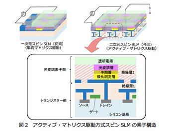 今回、駆動電流の低減を図った光変調素子を用い、素子ごとにトランジスターを配置することで正確かつ高速に各素子を駆動できるアクティブ・マトリクス方式による二次元スピンSLMの試作に世界で初めて成功。スピンSLMの駆動にアクティブ・マトリクス方式の適用が可能になったことで、立体像の動画を表示できる将来の超多素子SLMの実現に向け、大きく前進したという。