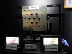 これとは別に、レンズアレーと多画素のカメラから構成されるインテグラル立体撮影装置も開発。7台のカメラで多画素化を図り、1台で撮影する場合と比べて、見える範囲を水平・垂直ともに約2.5倍に広げた立体像を動画で展示している。