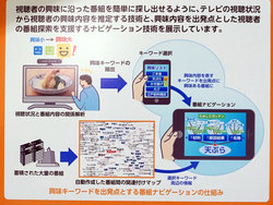 視聴者は、このキーワードをタップすることで、その言葉に関連した番組を知ることができるという仕組み。このための番組探索ナビゲーションも今回併せて開発している。このナビゲーション開発にあたっては、インターネット上にある大量のテキストを解析してラレ他言葉の意味的なつながりを使って番組を紐付け。これにより、例えばグルメ番組で「天ぷら」に興味を持った場合に「胸焼け」という言葉へつなげ、健康情報を扱う「ためしてガッテン」をオススメするなどといったように、一見関係ないように見える番組を発見することもできるようにした。