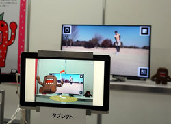 そして体験型展示ではテレビとタブレットを連携させた「飛び出すテレビ」もデモ。テレビのなかにいたキャラクターが、いつの間にか視聴者のタブレットに飛び出してくるというもので、テレビに向けるタブレットの角度を変えると、キャラクターの見え方なども連動する。