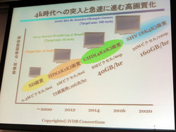 4KとiVDRメディアとの関係性については、iVDRコンソーシアムの日置氏も言及。「仮に放送を録画することを考えた場合、現状、TS録画だと1時間で10GBくらいの容量が必要で、単純に計算すると4Kでは40GB、8Kで160GBということになる。ここで、1TBのiVDRであれば、8Kがきても6時間くらいは記録できる計算になる。それなりに使えるメディアとして存在しているのではないか」と述べた。