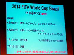 次世代放送推進フォーラム(NexTV-F)による、4K試験放送が本日よりスタート。記念式典では、開幕を間近に控えるサッカーブラジルワールドカップの4K放送を4試合行うことを発表した。