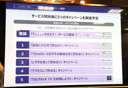 キャンペーンは本日より開始し、当面のあいだ、1ヶ月単位でキャンペーンを入れ替えていく。各キャンペーンには「キャンペーンオーナー」という主催者がおり、これは各キャンペーンごとに変わる。当初はTimeOn(東芝)、T-POINT、TSUTAYA TVがキャンペーンオーナーとなるが、今後、ほかの会社の参加も募っていく。