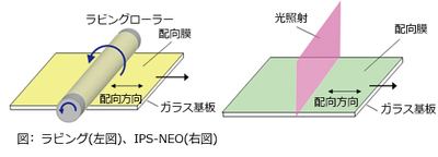 液晶パネルの製造においては、一般に液晶分子の向きを同じ方向に揃える製造時の配向プロセスに、配向膜に布を巻き付けたローラーで一定方向にこする・ラビングという方法をとる。しかしこのラビングでは、ガラス基板上に形成された回路パターンの段差によって配向できなかったり、こする過程で異物が発生したりすることで、製造歩留りに影響を与える場合があった。IPS-NEOは、同社独自の光照射配向プロセスを採用することでこれらの問題を解決している。
