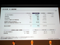 ソニーは、2014年度第一四半期の連結業績を発表。売上高は前年同期比5.8%増の1兆8,099億円、営業利益は前年同期比343億円増の698億円、純利益は前年同期比237億円増の268億円だった。