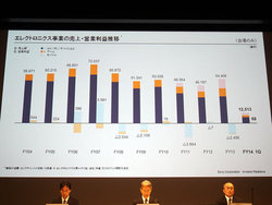 プレス向けの発表会で説明にあたった代表執行役EVP CFOの吉田憲一郎氏は、営業利益について、エレクトロニクス事業だけの売上高の推移も改めて紹介。「2012年度は資産売却益や再評価益を除くと2,398億円の赤字だった。実質的には過去3年、大きな赤字を計上し続けている」と振り返る。そして「当四半期の営業利益は61億円の黒字だが、ここには不動産売却の一時的な利益が148億円入っており実質ベースでは80億円の赤字だ。エレキの赤字構造は改善しているが、まだ転換はできていない。構造改革は着実に実行していく必要がある」と述べた。