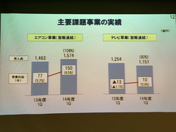 なお、主要課題事業の1つとしていたテレビ事業は、製版連結で売上高が前年比92%の1,151億円となったものの、前年13億円の損失であった営業利益が今期で10億円の黒字に転換した。本日開催された決算発表会では、代表取締役専務 河井英明氏が登壇し「テレビは大型製品のラインナップを拡大させてきた。若干ではあるが、計画を上回る形でテレビ事業全体が改善できた」とコメントした。