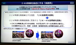2Kコンテンツの高画質化については、4K映像へ最適なアップコンバートを行う「AQUOS 4K-Master Engine PRO」を搭載。2K映像を高画質化する「2K高画質化回路」に加え、2K映像を高精細な4K映像に変換する「2K→4K高精細化回路」から構成される。