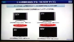 U20ラインは設置性にも配慮。スリムフレームのコンパクトデザインとすることで、40型の場合は2006年夏の32型フルHDモデル「LC-32GH2」、50型の場合は同年の37型モデル「LC-37GX2」と同程度の設置スペースで、高精細化と画面サイズ拡大が可能になるという。たとえば40型4Kモデルの画素サイズは、32型フルHDモデルの0.63倍となる。同じく50型の4Kモデルに買い換えても画素サイズは0.75倍となるため、大型化しても、画素サイズはむしろ小さくなるということになる。