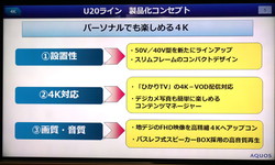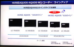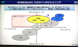今回のU20ラインは画面サイズを小さくし、また価格も手ごろにすることで、4Kテレビのユーザー層を広げ、パーソナルユースへの拡大をねらっていく。今後同社では、4K対応AQUOSを2ライン5サイズ(70/60/52/50/40型)で展開していく。