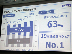 中でもビジネス向けのプロジェクター分野については、同社製品が19年連続シェアNo.1であり、2014年1Qの国内シェアも63%を同社製品が占めたことに触れ、「デスクトップ型がエプソンビジネスプロジェクター事業の主軸領域であり、これまでにも大きな評価を頂いている。市場における現在のポジションをしっかり維持していきたい」と述べた。