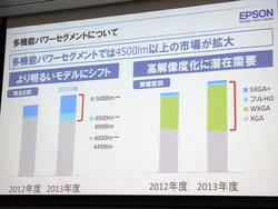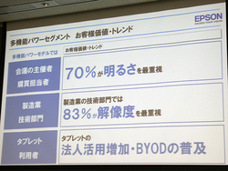 なお、同社によるビジネスプロジェクター分野のカテゴリ別シェアをみると、“スタンダードモデル”や“モバイルプロジェクター”などのカテゴリではエプソン製品のシェアが8割前後であるが、今回新製品をラインナップした“多機能パワー”カテゴリーにおいては48%のシェアにとどまるという。これについて鈴村氏は「まだ伸長する分野であると考えており、今年は特に“多機能パワー”カテゴリーの製品に力を入れていきたい」とした。具体的には、「より明るく、より高解像度であるというトレンド」を押さえ、タブレットなどのスマートデバイスとの連携機能に対応している。