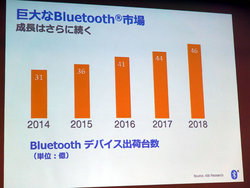 Bluetoothの現状については「2014年には対応機器が30億台を超えた。2018年には46億台に達するのではないかと予想されている。2018年までにはフィーチャーフォンも含むすべての電話の96%がBluetooth Smart Readyになるだろう」と紹介。「Bluetoothは今やグローバルスタンダード。これからはBluetoothが必ずスマホ/タブレットに入っているという前提で世の中が進む。ここまで広いワイヤレスのテクノロジーは他にはないだろう」とアピールする。